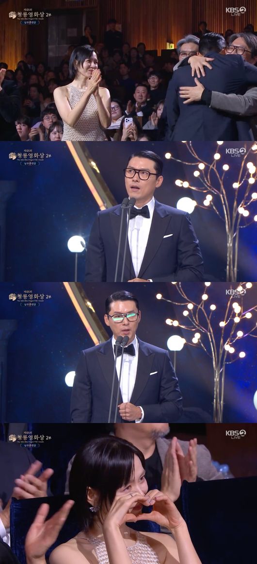 そして客席に座る妻ソン・イェジンへ向けて、「いつも静かに支えてくれる家族、会社の仲間、ファンの皆さん、『ハルビン』を愛してくださった観客の皆さんに心から感謝している。存在してくれるだけで大きな力になる妻イェジンさん、そして息子に心から愛していると伝えたい」とメッセージを送り、その瞬間にカメラに抜かれたソン・イェジンは手ハートを作って見せ会場を温かい空気に包んだ。