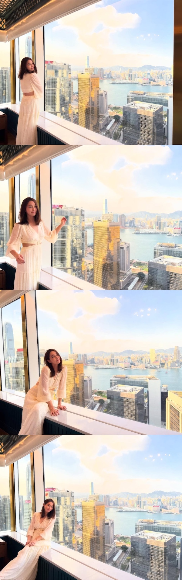 香港の街並みを一望できる大きなガラス窓の前に立ち、優雅なポーズをとったイ・ミンジョン。ウエストの切り替えが印象的なドレスを身にまとい、まさに“女神”のようなオーラを放っている。