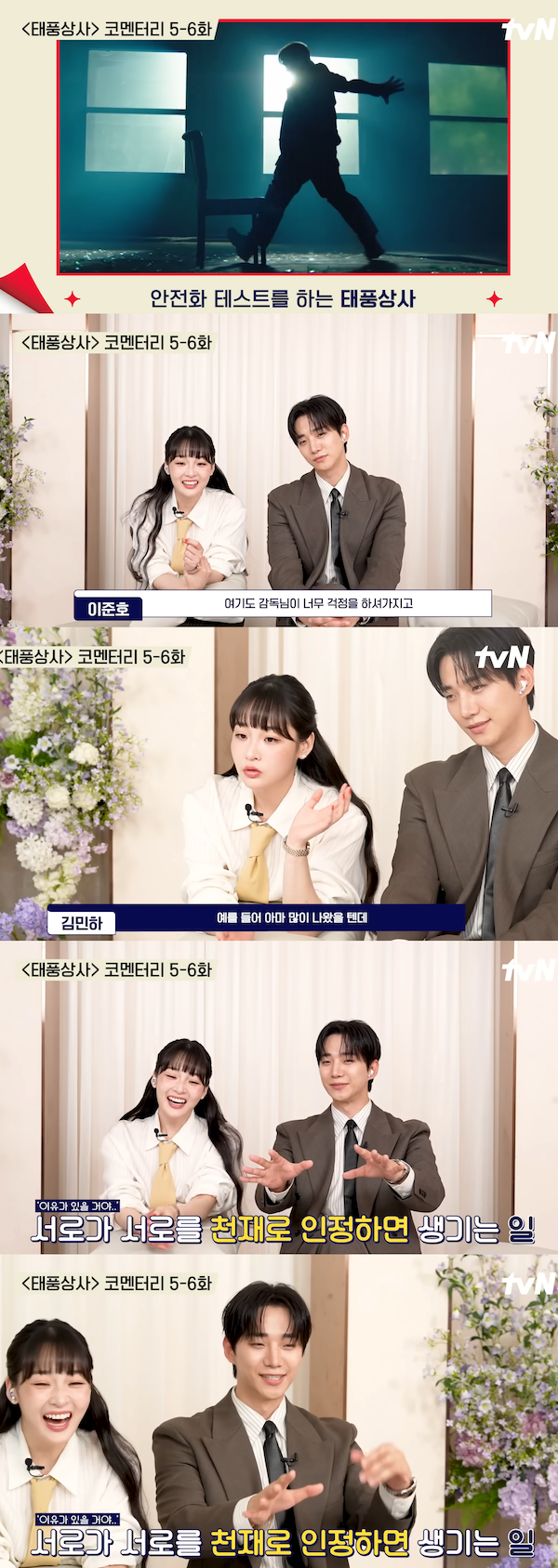 これに対し、キム・ミンハは「本当にすごくない? 体の使い方が上手。もちろんダンスもすごく上手だけど、演技の時も身体表現が本当にうまい」と絶賛。「例えば転ぶふりをするシーンも全部本物みたいで、私が思わず悲鳴を上げたほど。走るだけじゃなく、体全体で演技するから、毎回感心している」と語った。