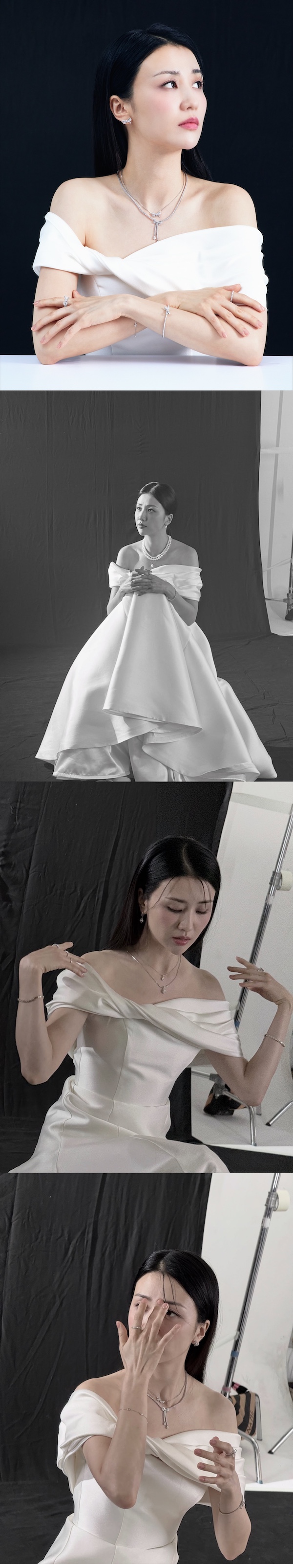 オフショルダーの白いドレスを身にまとい、優雅にポーズをとっているパク・ハソン。光沢のあるサテン素材のドレスは肩のラインを美しく見せ、上品でフェミニンな雰囲気を漂わせている。