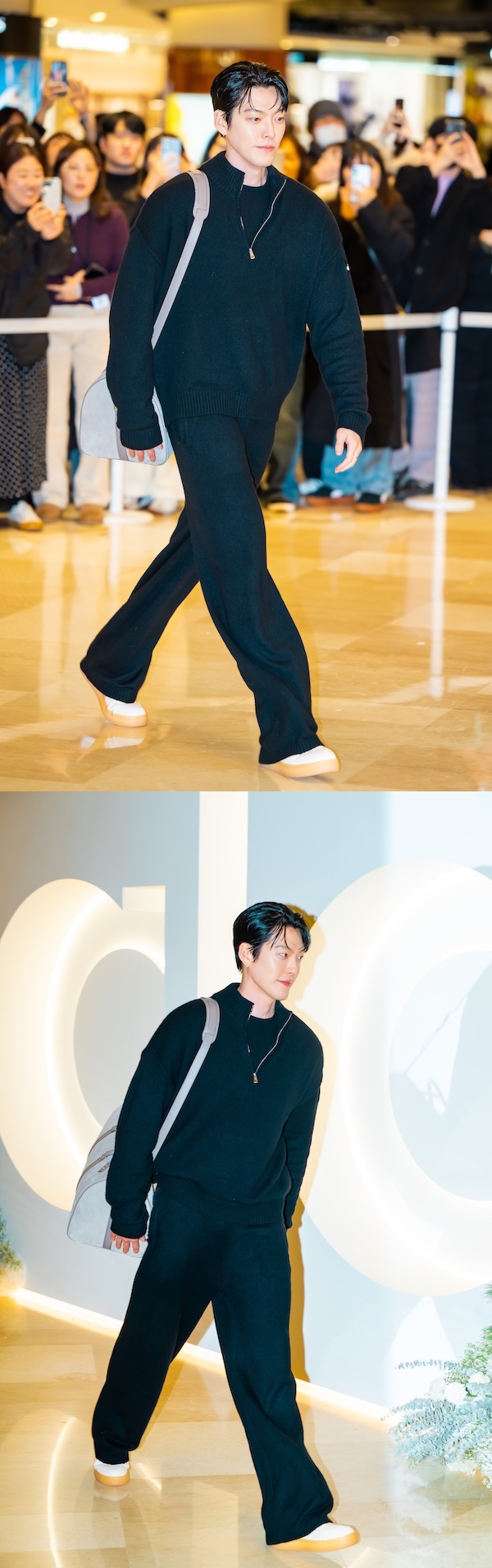 季節感のあるオールブラックのスタイリングで、リラックス感と洗練さを兼ね備えたムードを演出したキム・ウビン。柔らかな質感のブラックニットとパンツを合わせたミニマルな装いに、肩に自然に掛けたグレーのショルダーバッグがモノトーンのトーン・オン・トーンを描き、都会的な雰囲気を引き立てた。